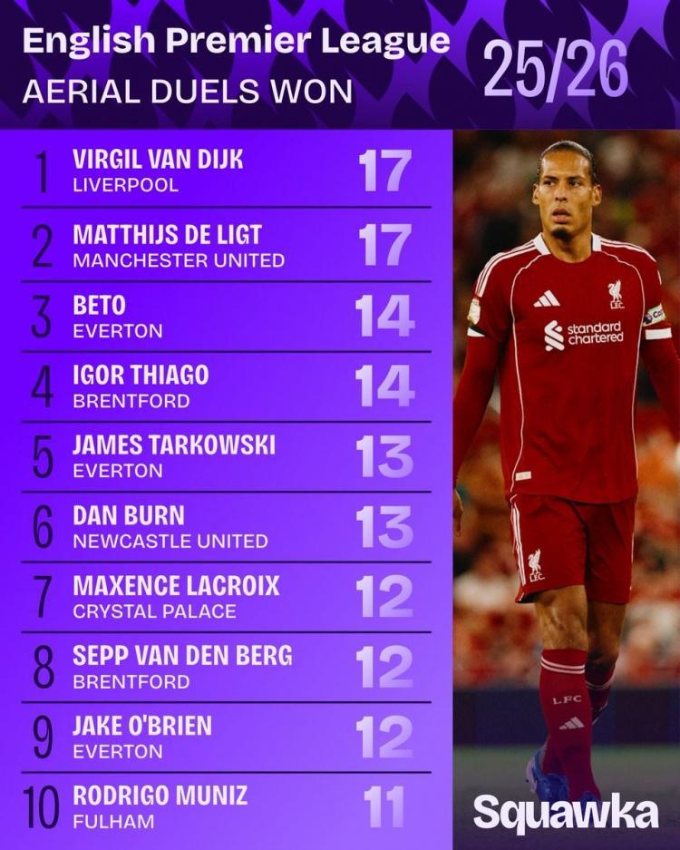 直播吧9月3日讯 数据机构squakwa统计了新赛季英超球员解围情况,两位荷兰中卫并列榜首。
