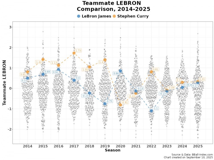 9月12日,数据媒体BBall-Index发布了一张对比图,分析2014至2025年间勒布朗·詹姆斯与斯蒂芬·库里所搭配队友的实力水平。